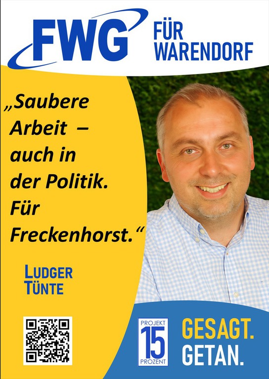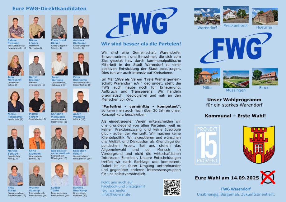 Die FWG Warendorf bereitet sich nun nach der Wahl auf die neue Wahlperode vor. Wir würden uns sehr freuen, noch Mitstreiterinnen und Mitstreiter aus den Ortsteilen und der Kernstadt für uns gewinnen zu können! Schreiben oder rufen Sie uns an, wenn Sie auf politische Arbeit im Ehrenamt haben!